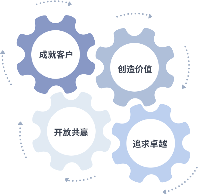 成就客户是一切决策的出发点,,,,创造价值是衡量所有工作的标准,,追求卓越是我们做事做人的态度,,开放共赢是我们的格局也是最终的结果。。。价值观的齿轮环环相扣,,,,推动着组织里的每个人不断向前。。